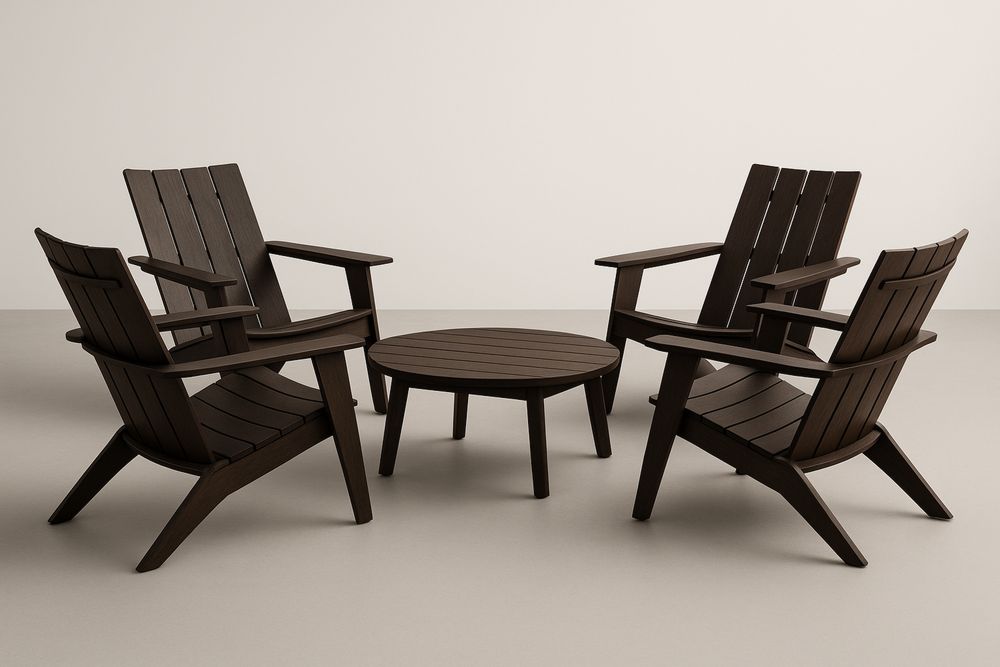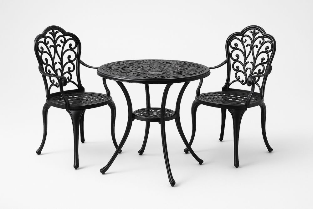 Stół o średnicy 70 cm i wysokości 75 cm oraz dwa krzesła o wysokości 90 cm, szerokości 55 cm i głębokości 60 cm.